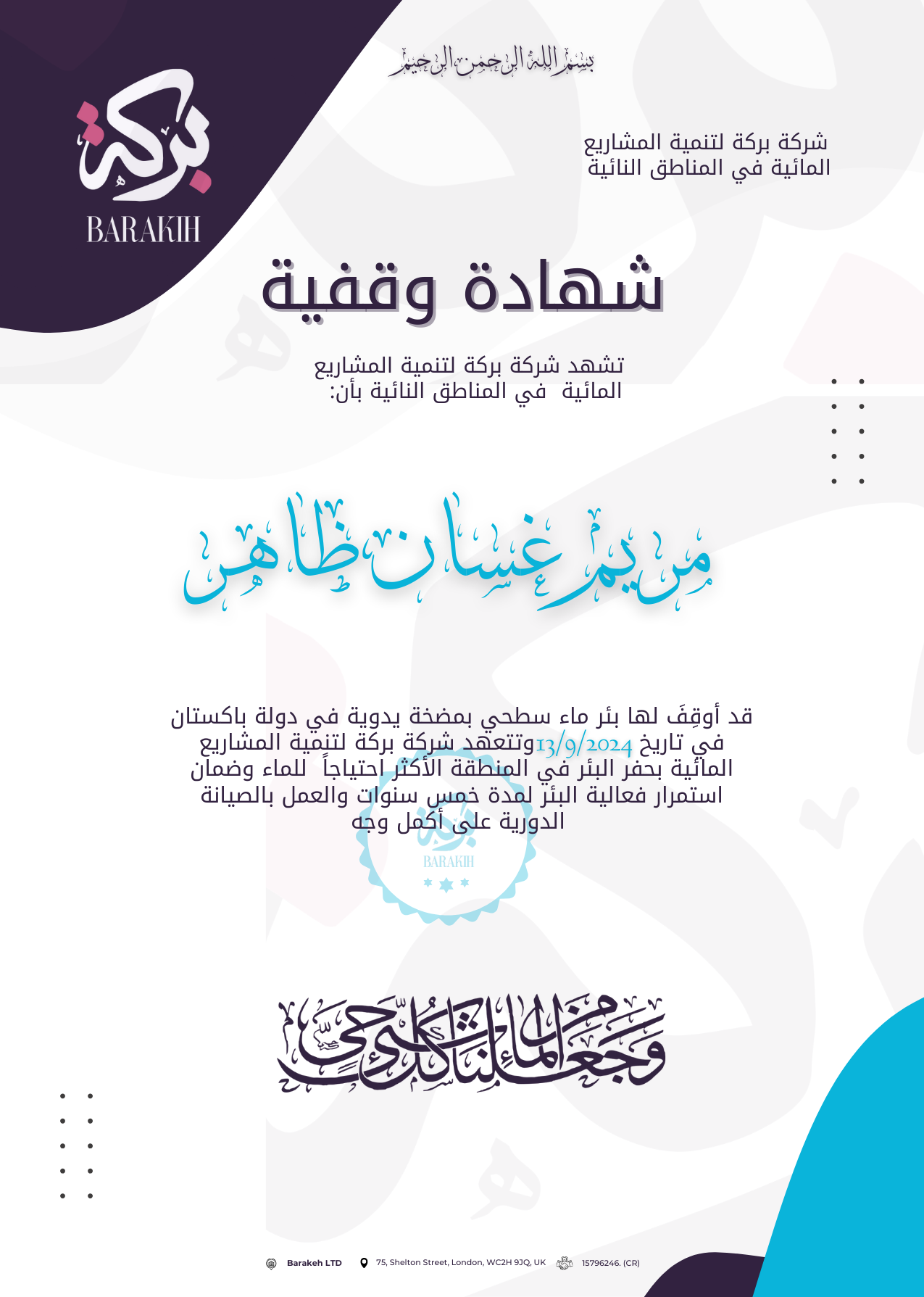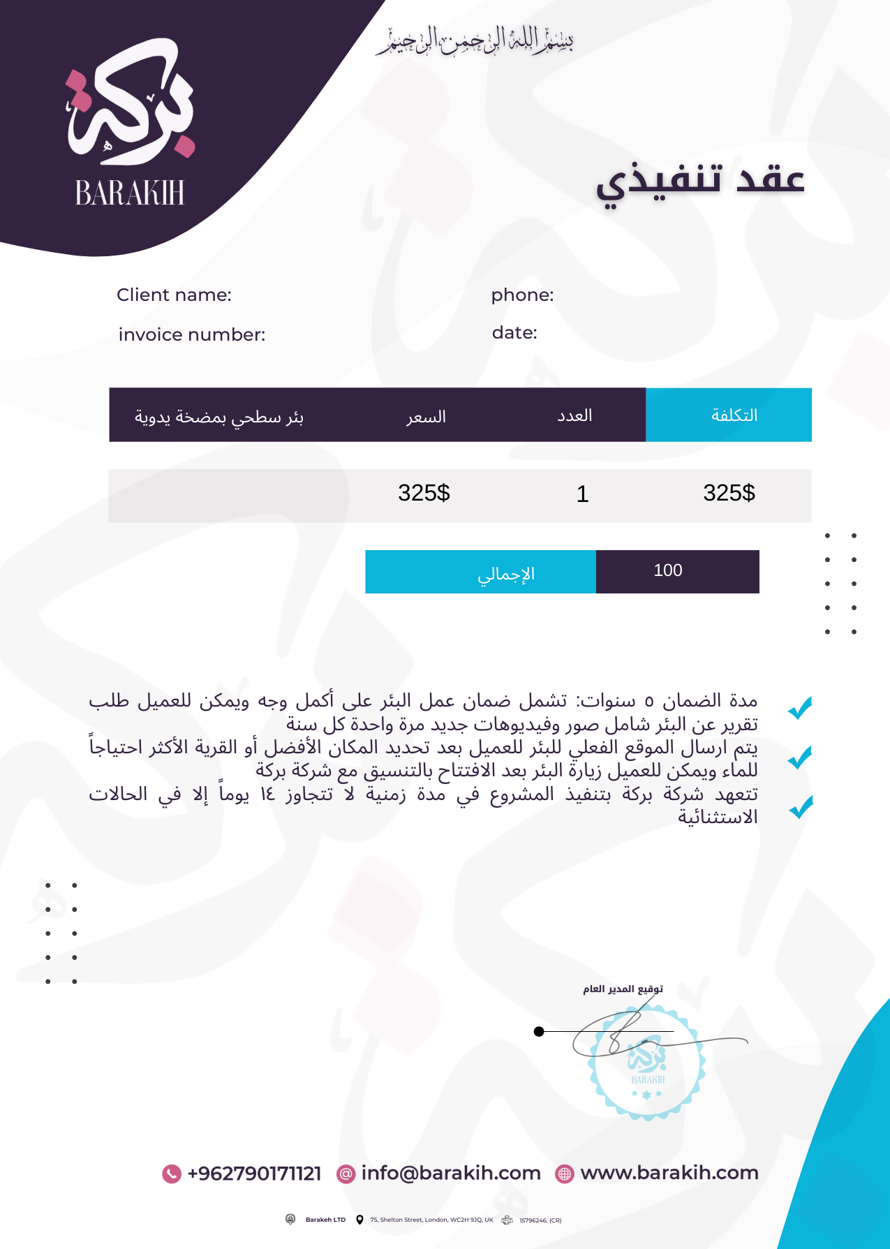 يتم تسليم العقد التنفيذي لكل عميل لدينا ويشمل ضمان عمل البئر لفترة ٥ سنين بأذن الله